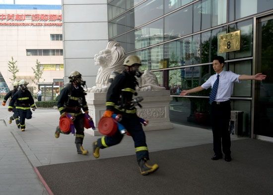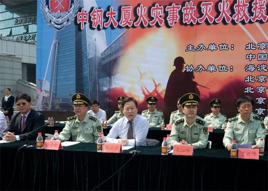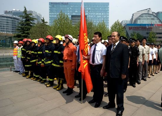 According to the policy of “Prevention prior, Combining prevention and detection”, Sinosteel cooperated closely with Haidian Public Security Bureau Fire Department, and held a fire drill on May the 7th, to ensure the risk-combating ability and the safety of staffs and properties. Secretary Zhang Hanguang of Sinosteel, and vice-president of Sinosteel Corporation Limited Mr. Gong Jingsheng watched the fire drill.