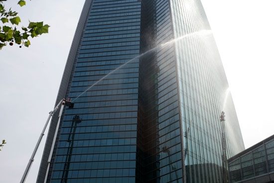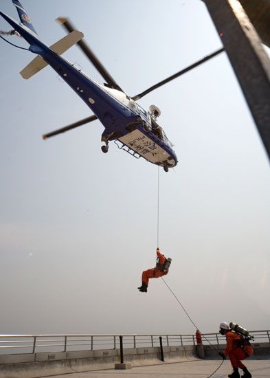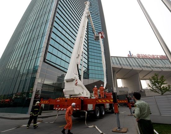 The fire drill lasted for 40 minutes, with a stimulated fire occasion happened on the 18th floor. After discovering the fire, Sinosteel Plaza started the fire evacuation pre-arranged plan. While the employees inside the building evacuated quickly out the building, the volunteer fire brigade started rescue work as well. With close cooperation, the fire drill successfully accomplished all kinds of maneuvering including rescuing through escape chute, water spray for fire control etc.