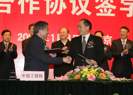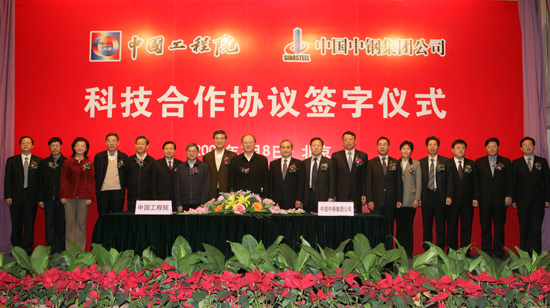 On the afternoon of January 8, Sinosteel Corporation signed the science & technological cooperation agreement with Chinese Academy of Engineering in Beijing Friendship Hotel. President of CAE Xu Kuangdi, Vice President Pan Yunhe, Wu Hequan, Liu Depei, Du Xiangwan and other leaders from CAE; Huang Tianwen, Zhang Hanguang and leaders from Sinosteel and stock company attended the signing ceremony. President Huang Tianwen and Vice President Wu Hequan signed on the agreement on behalf of each party.First of all, President Xu Kuangdi expressed his sincere congratulations to the establishment of the agreement. CAE will engage in policy-consulting and co-research, which surrounding Sinosteel’ s business requirements on mine resources, carbon materials, refractory, new energy sources, energy & environment, process technology of modern steel and other key technology fields. Faced with the adverse effects of financial crisis, joint research to further rely on science and technology innovation, promote sustainable development of enterprises. The spirit of CAE will exert each other’s advantages, stress on the key points, and emphasize practical results; jointly implement at the agreement, so as to realize co-development and win-win.