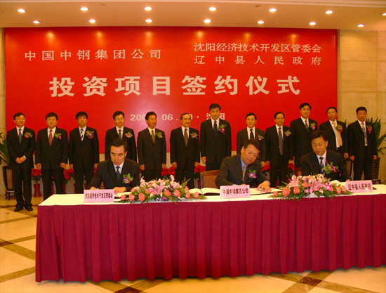 Sinosteel Vice President Jiang Hong, Chairman of Tiexi District of Shenyang Li Songlin, Head of Liaozhong County Lin Qiang Signing on the Agreement on Behalf of Each Party